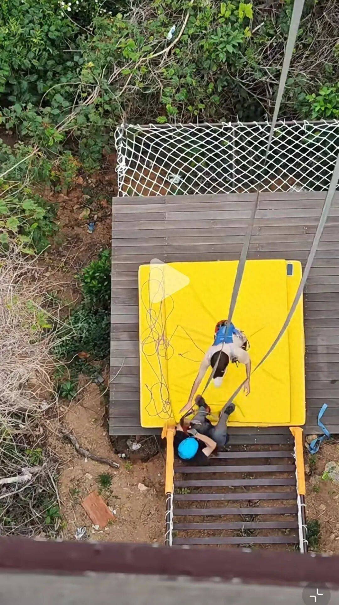 视频显示,该蹦极处底部搭建了一个平台,平台上放置着保护垫。王先生身上备有安全绳,从高台跳出时张开双臂双腿,下降持续了几秒钟,即将降至地面时,其双腿弯曲接触到保护垫,身体向后倾。工作人员见状立即去抓安全绳,想将他拉至保护垫上,但最终王先生还是跌坐在保护垫范围外的楼梯上。